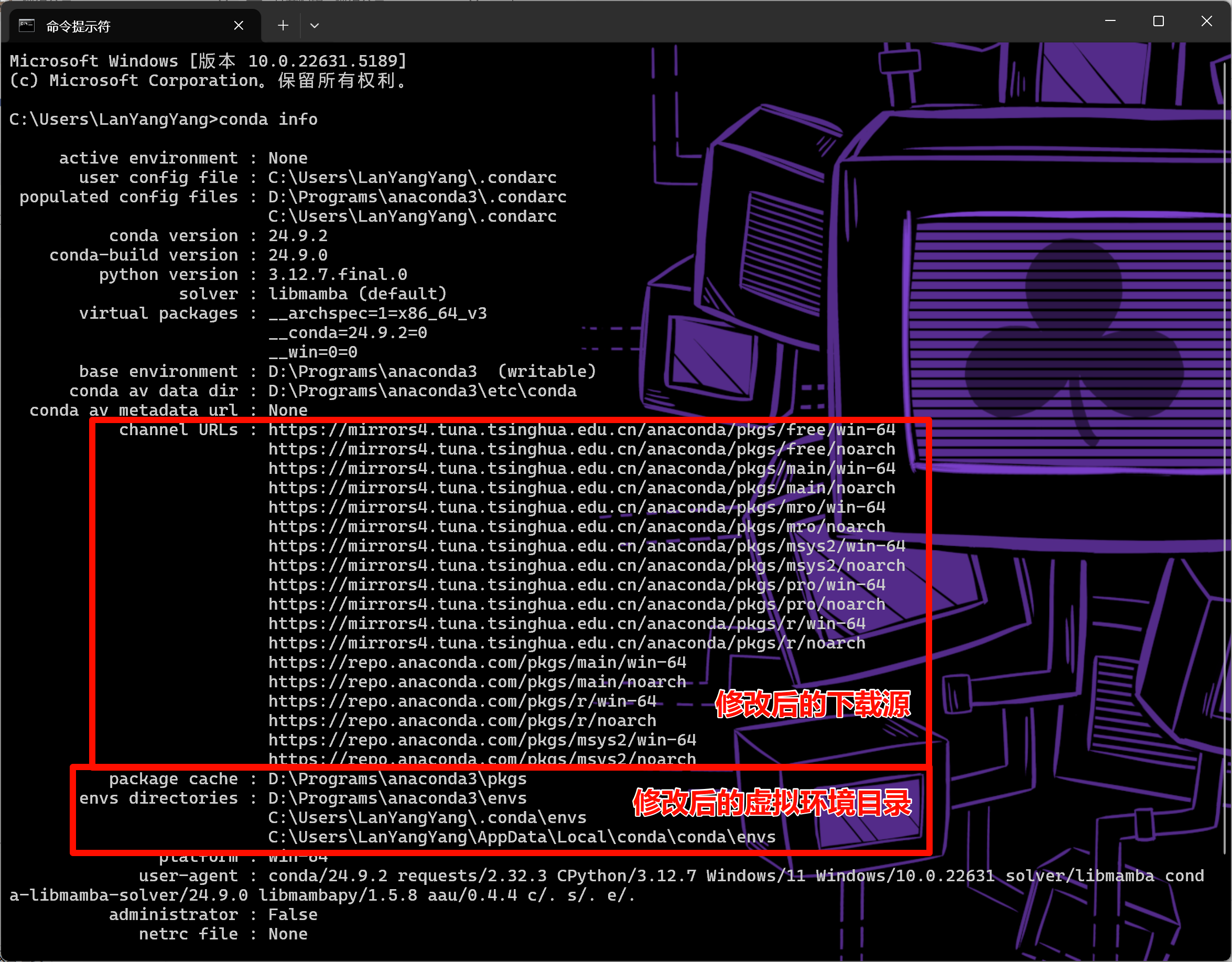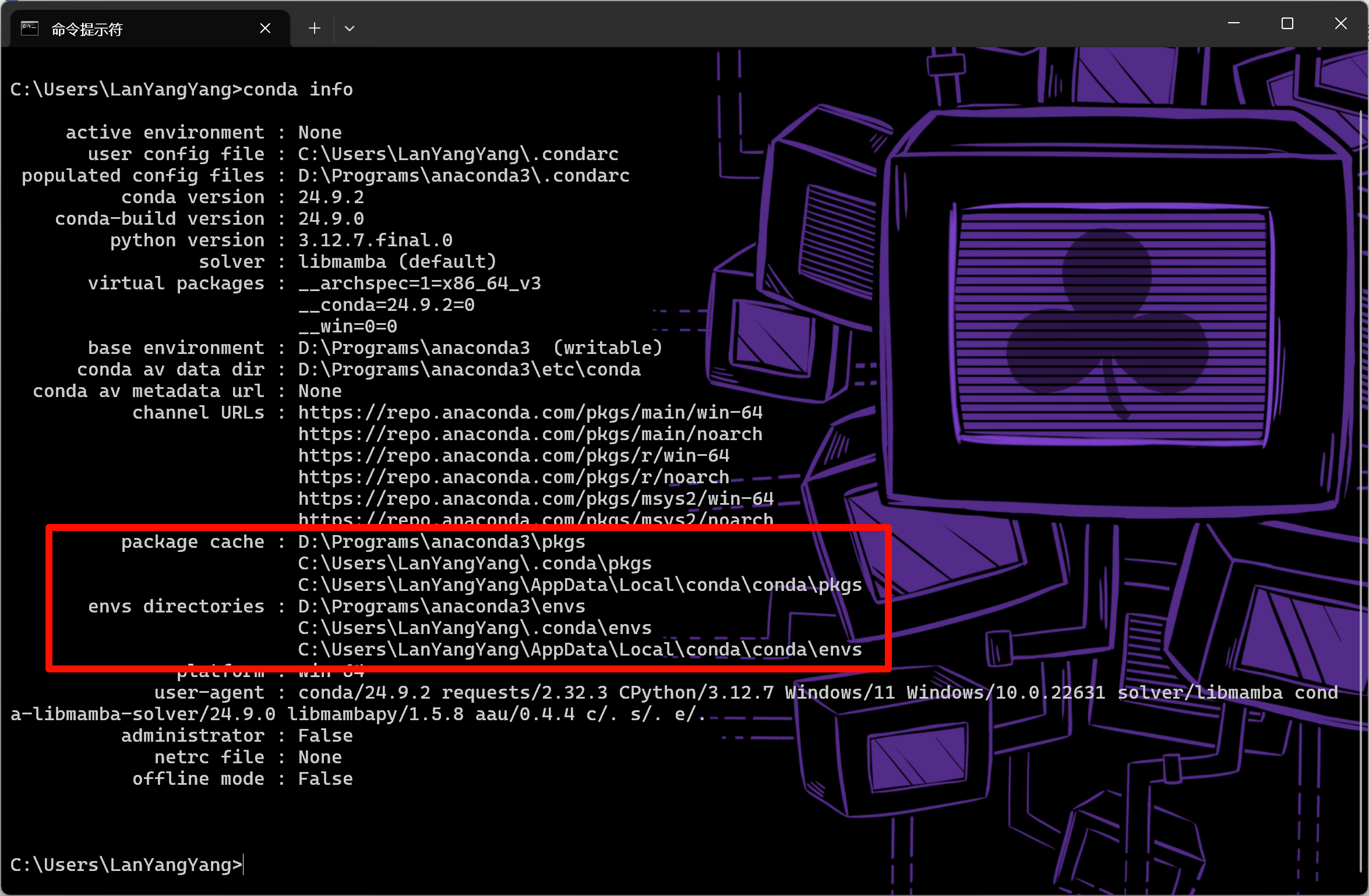 首先使用conda info命令确认现在的配置,可以看到默认配置是C:\Users\用户名\.conda下,我们需要修改它