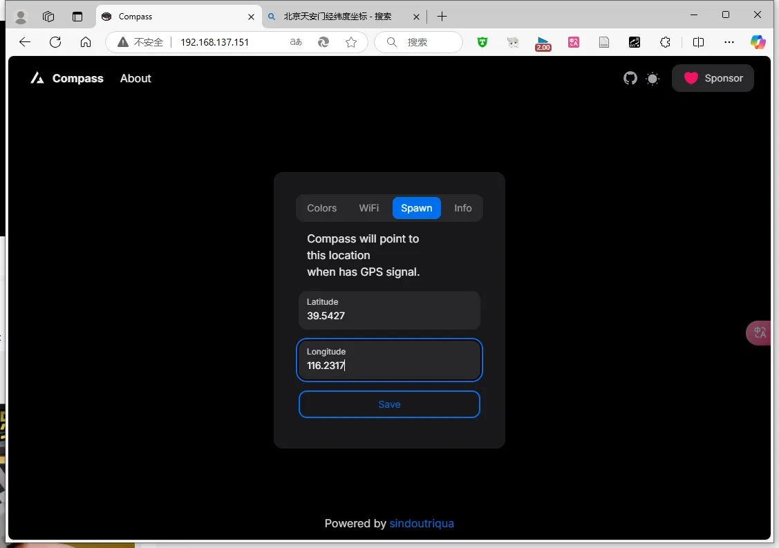 第一个输入框输入地点的纬度,第二个输入框输入地点的经度,点击Save保存