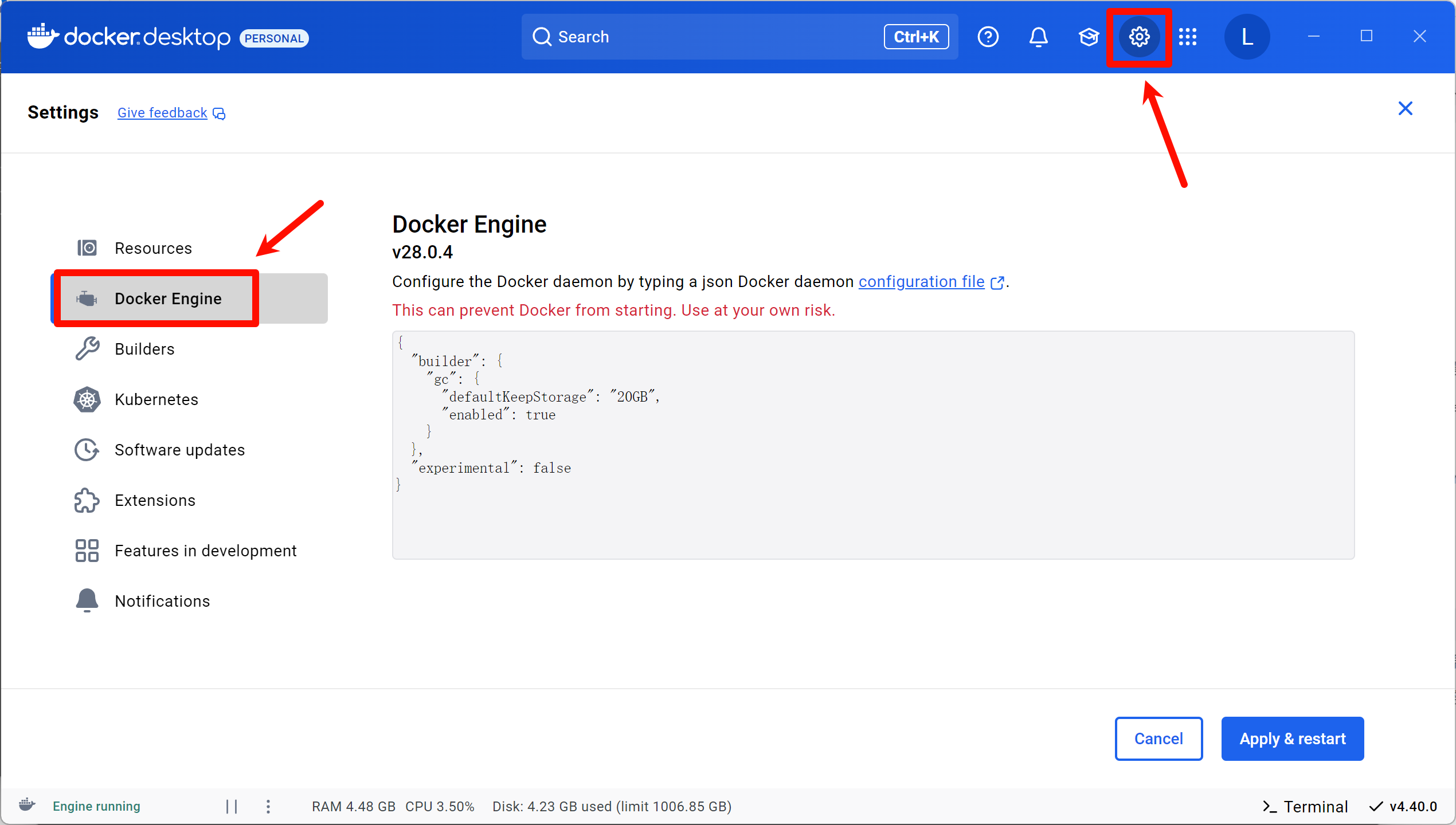 修改完成后点击右下角的“Apply & restart”按钮,会重启Docker,镜像源就设置完成了