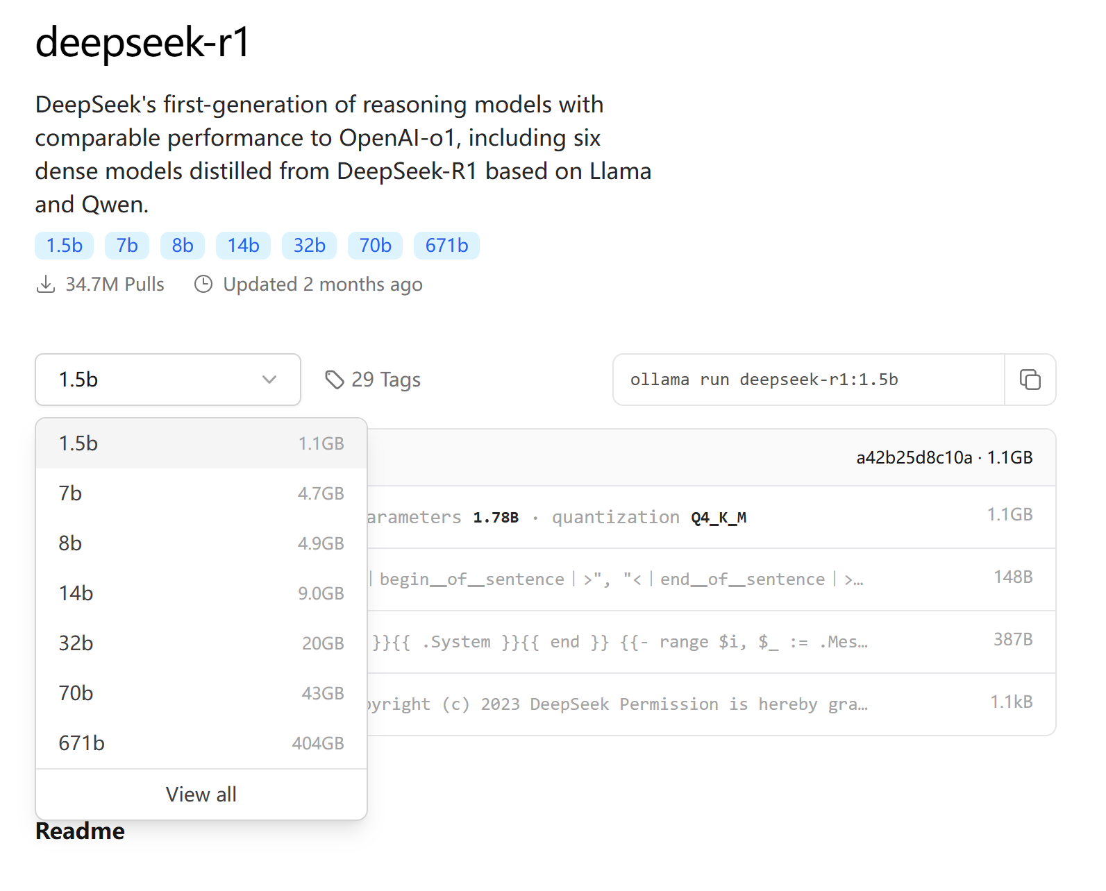 在这个页面可以选择具体的模型大小,此处的b指的是十亿(Billion)参数,比如1.5b代表这个模型有15亿的参数