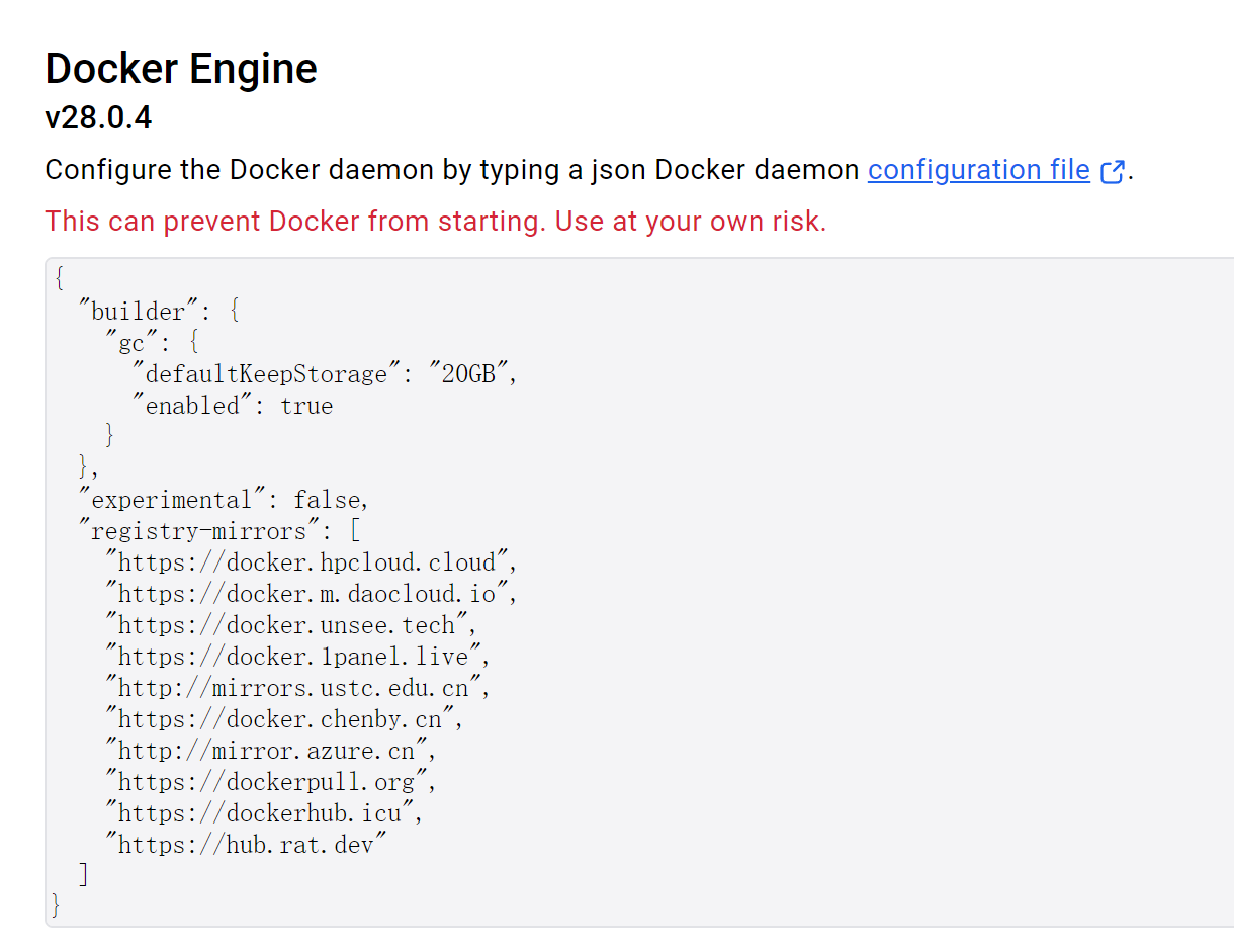 由于众所周知的原因,国内很难访问国外网站,因此使用Docker官方源下载要非常久,阿里云等大厂镜像源也因特殊原因关停,因此只能使用民间自建的镜像源