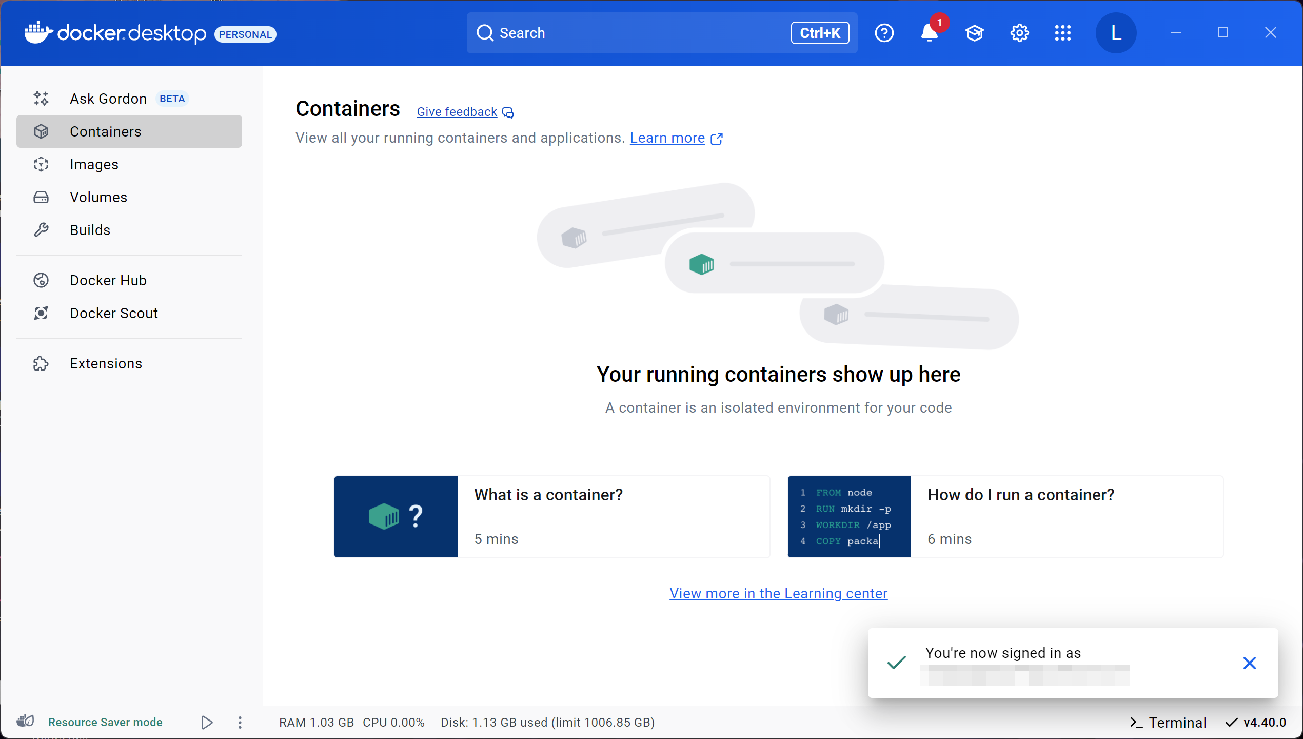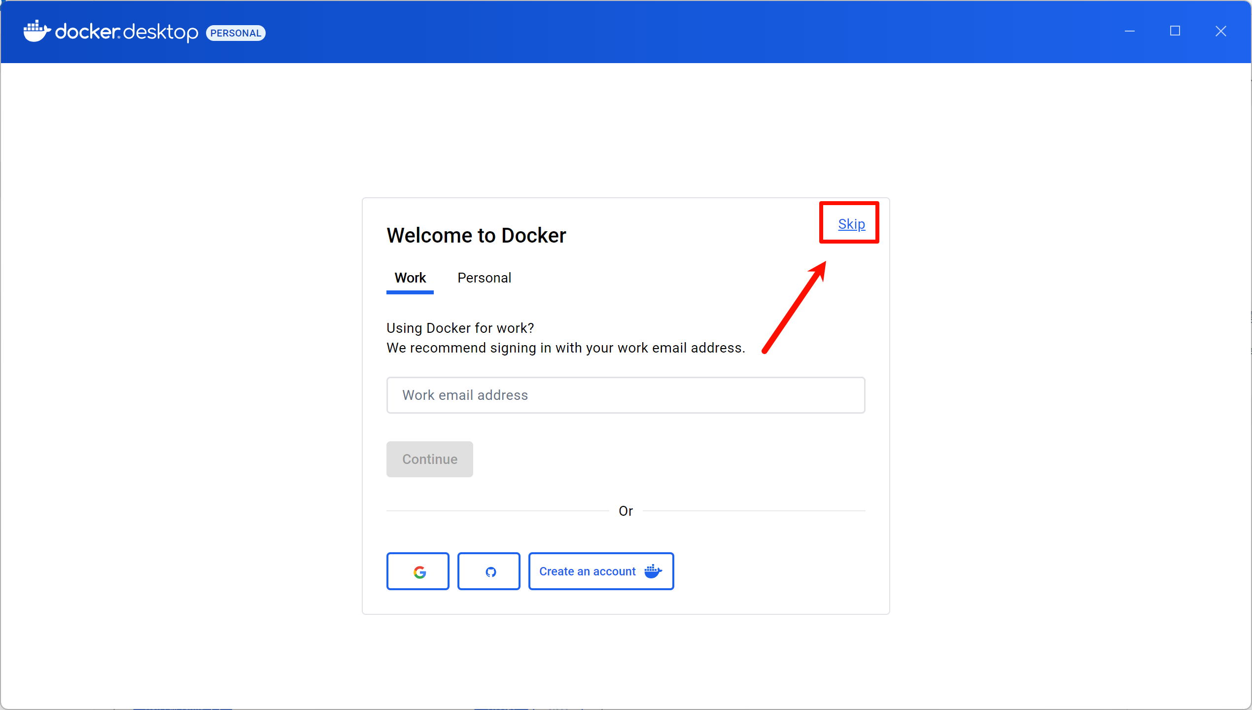 再之后会弹出Docker主界面,如果你需要的话可以登录账户,Work是工作账户,Personal是个人账户