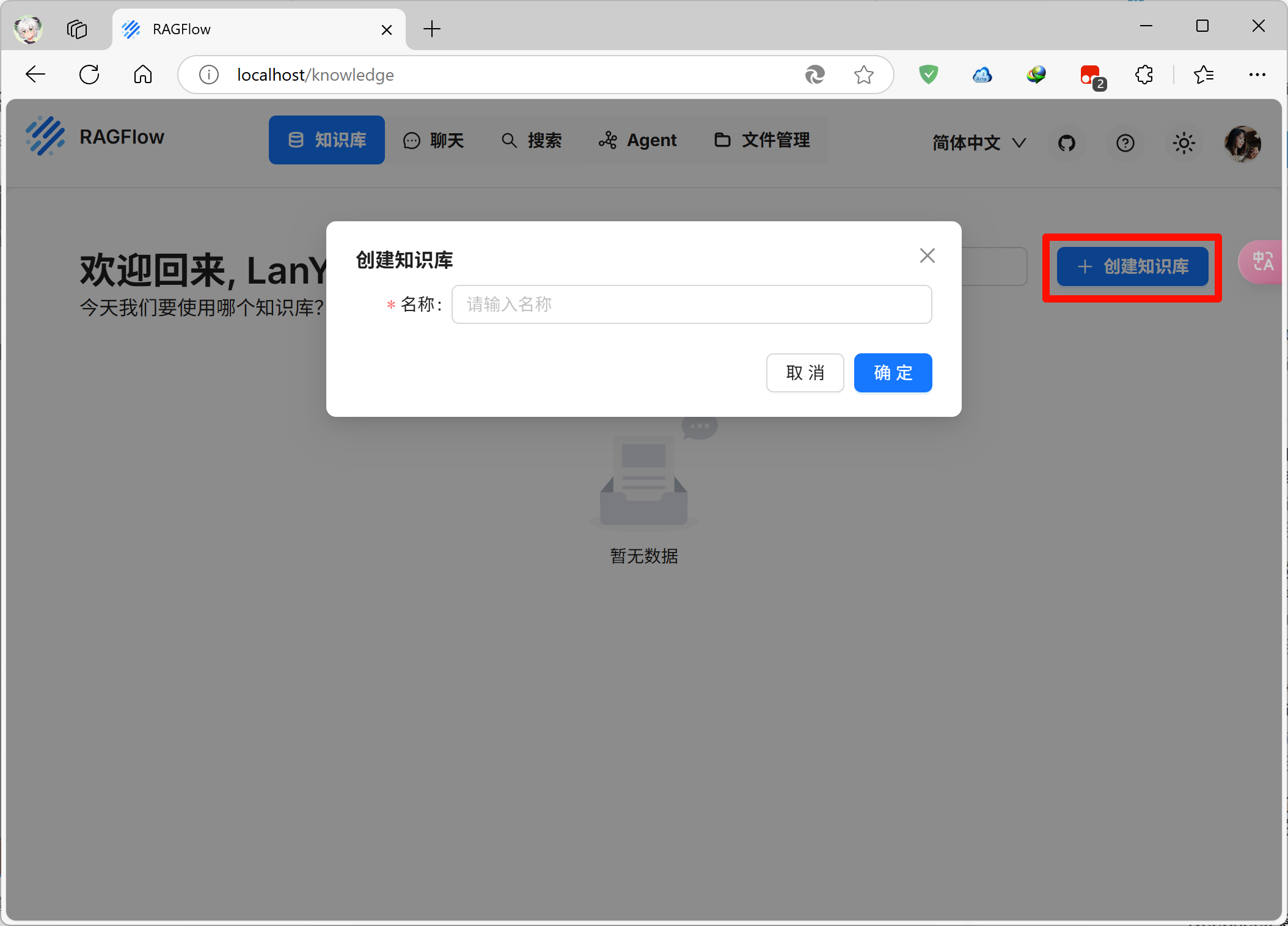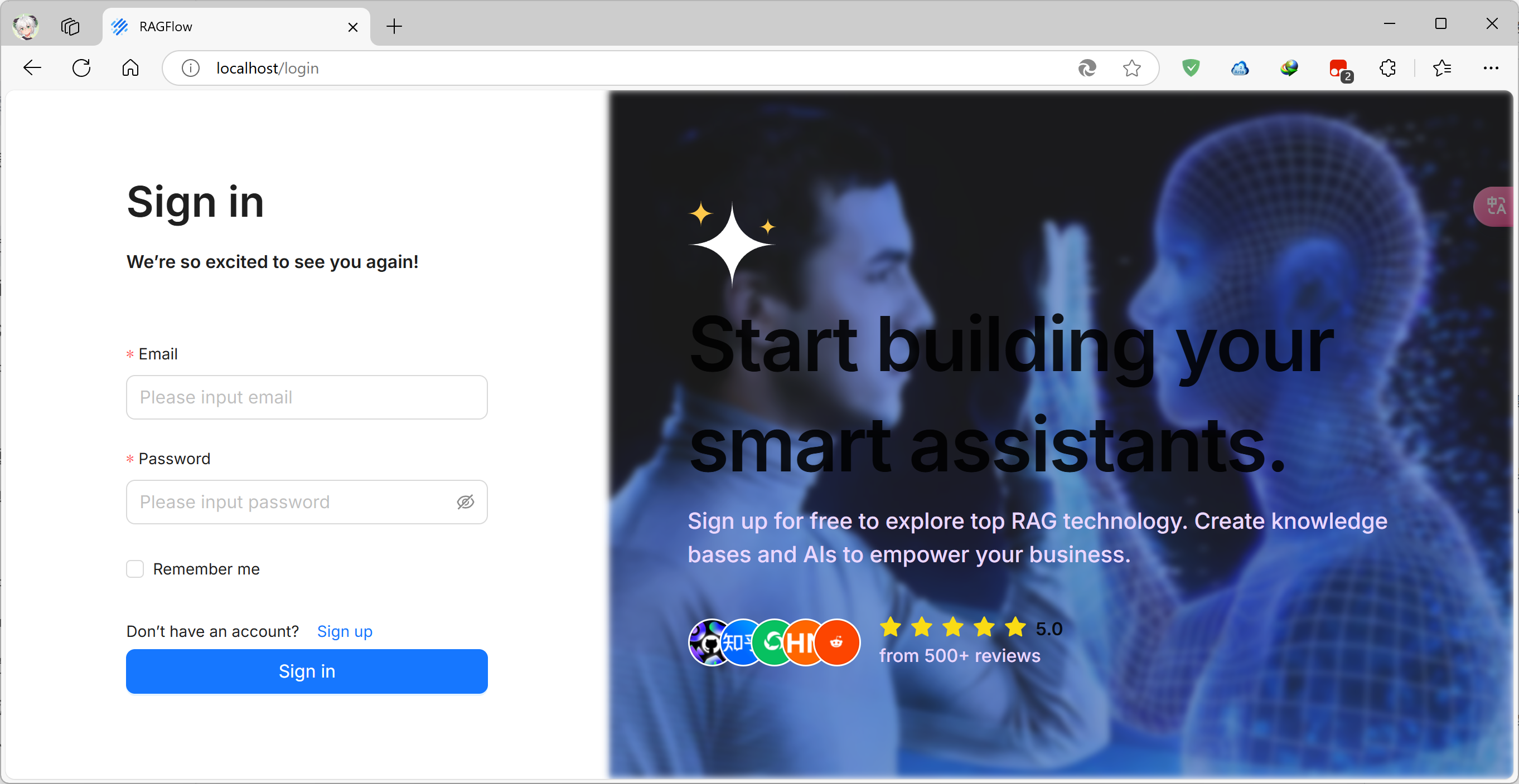如果你没有修改过文件,RAGFlow默认监听80端口,在浏览器地址栏输入localhost即可进入RAGFlow