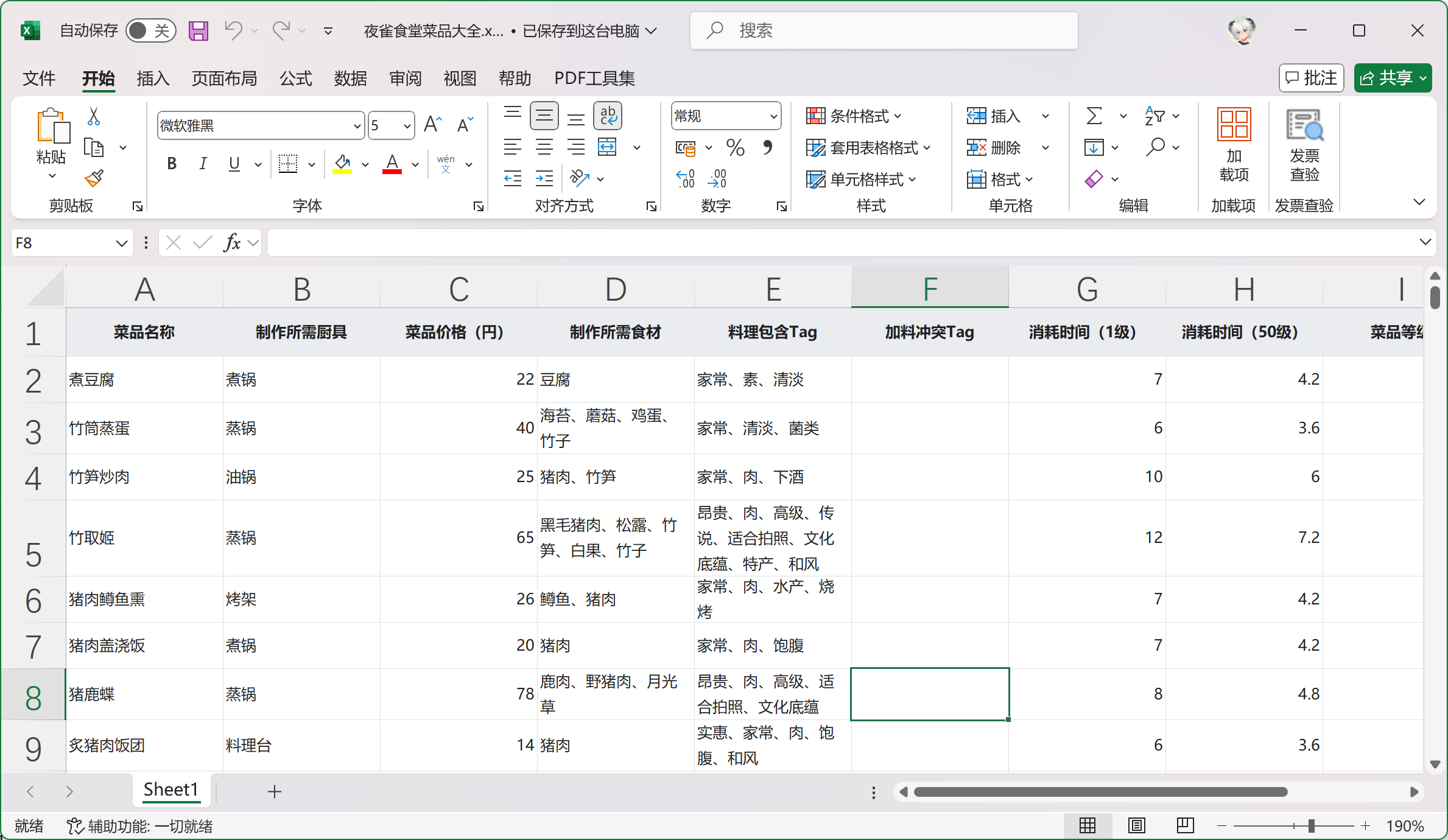 我以我喜欢的一款游戏《东方夜雀食堂》作为例子,这是一款模拟经营游戏,我将在知识库中添加这款游戏所有菜品的信息,让模型能够根据客人的喜好Tag和预算来给出推荐菜品