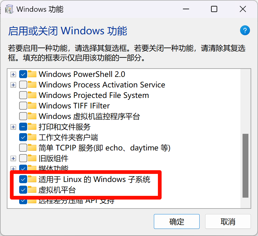 打开“虚拟机平台”、“适用于Linux的Windows子系统”,点击确定后等待添加功能,然后重启电脑