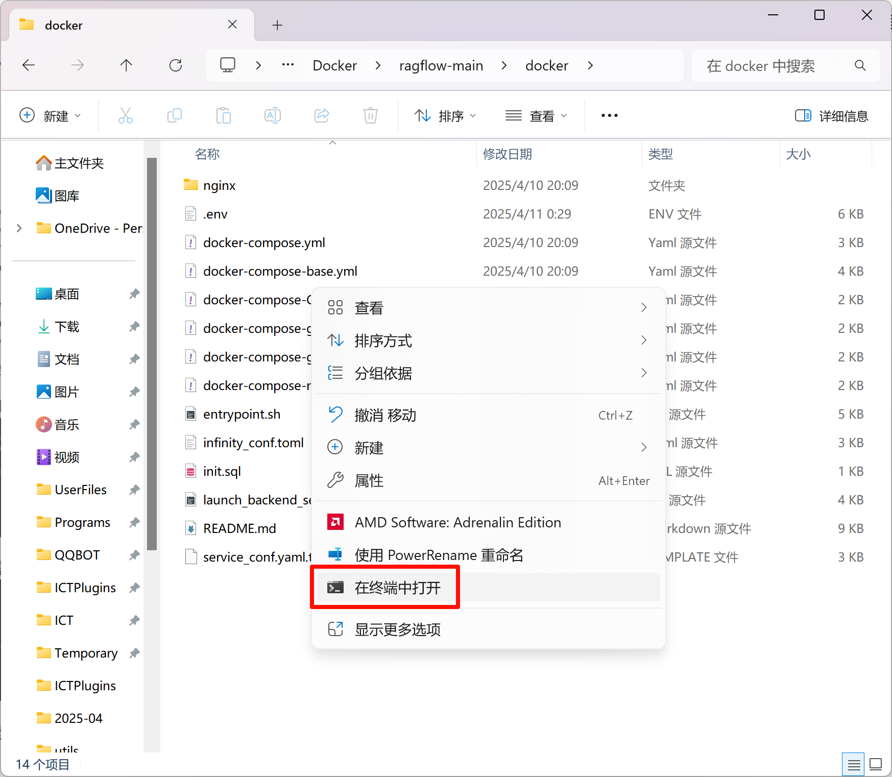 在刚刚的文件夹空白处右键,选择“在终端中打开”