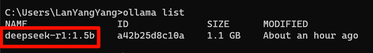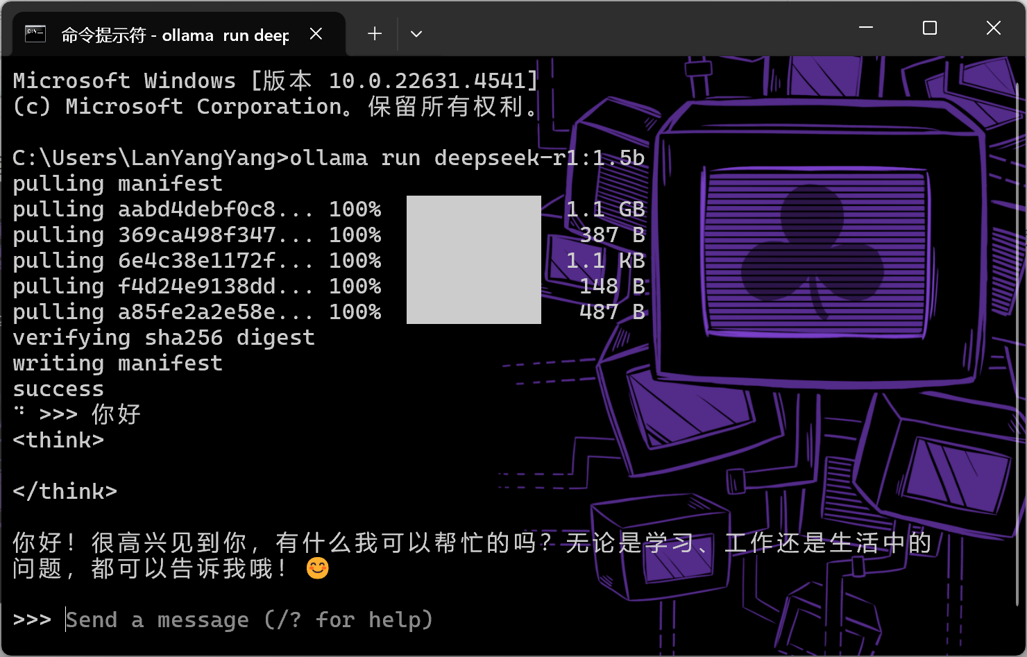 打开命令提示符(CMD),将刚才复制的命令粘贴到窗口,按下回车,Ollama会开始部署deepseek-r1 1.5b模型