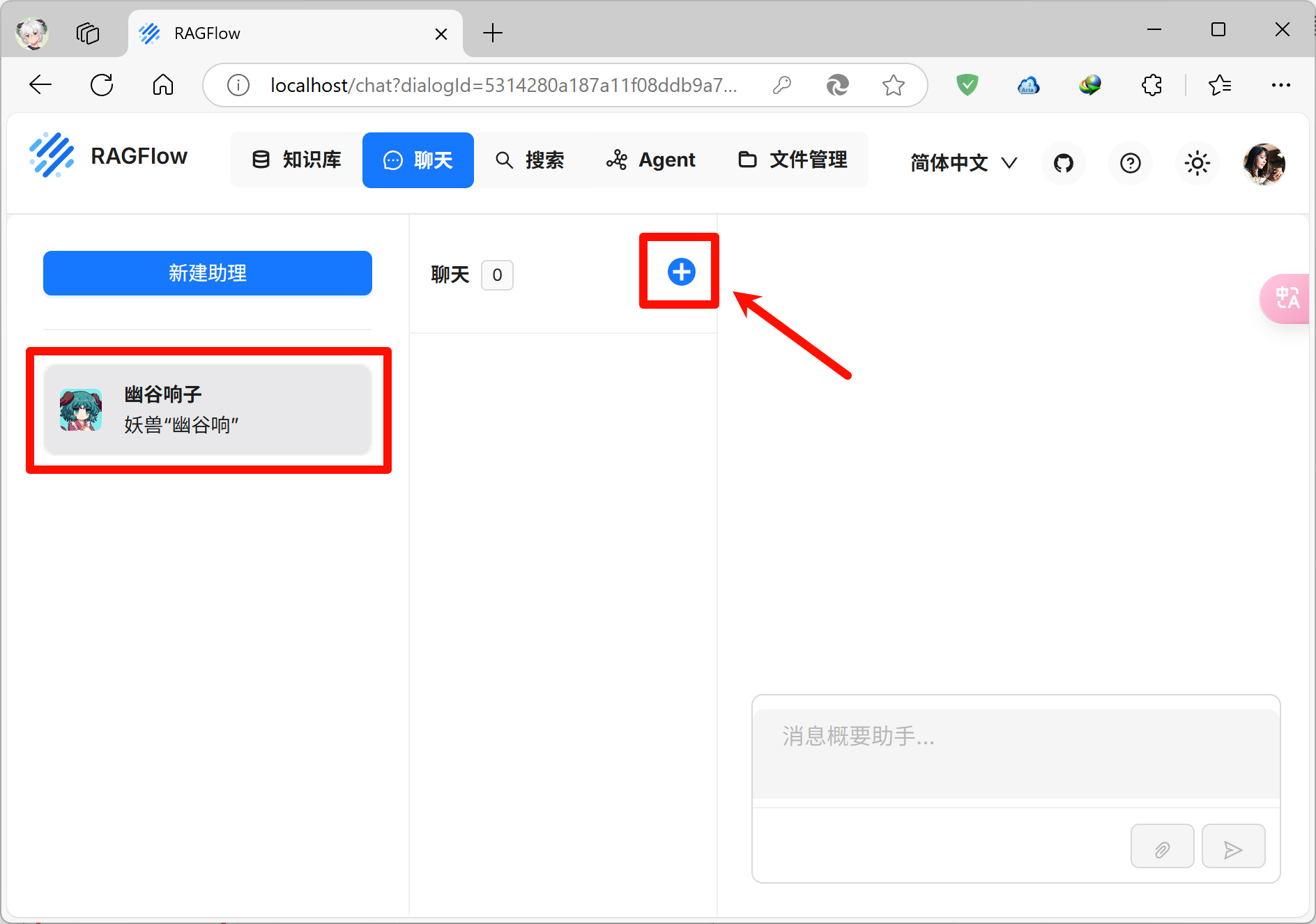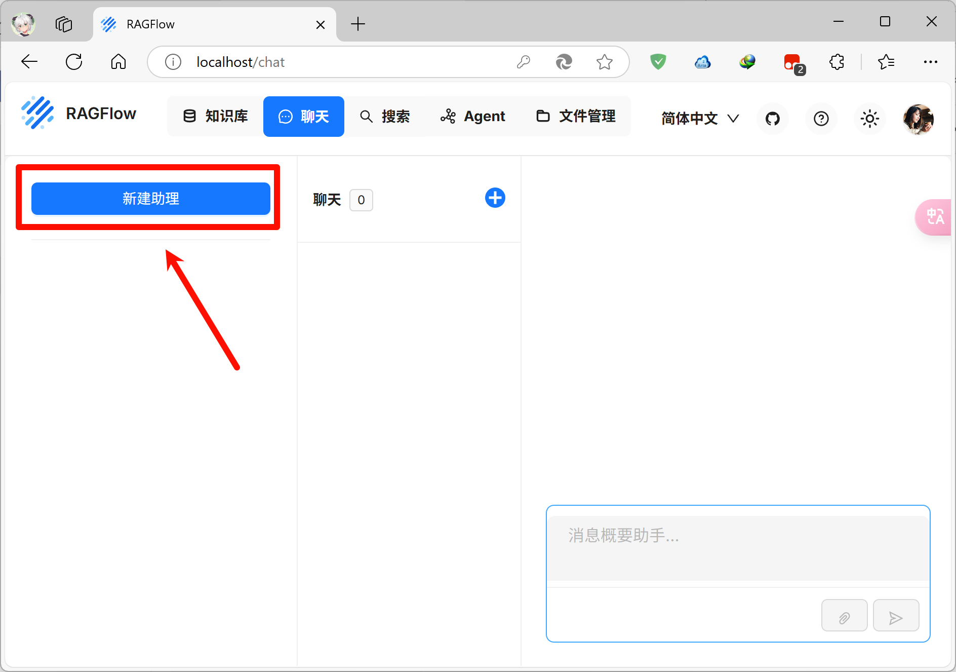 点击页面上方切换到聊天页面,点击左上角的新建助理进入聊天配置