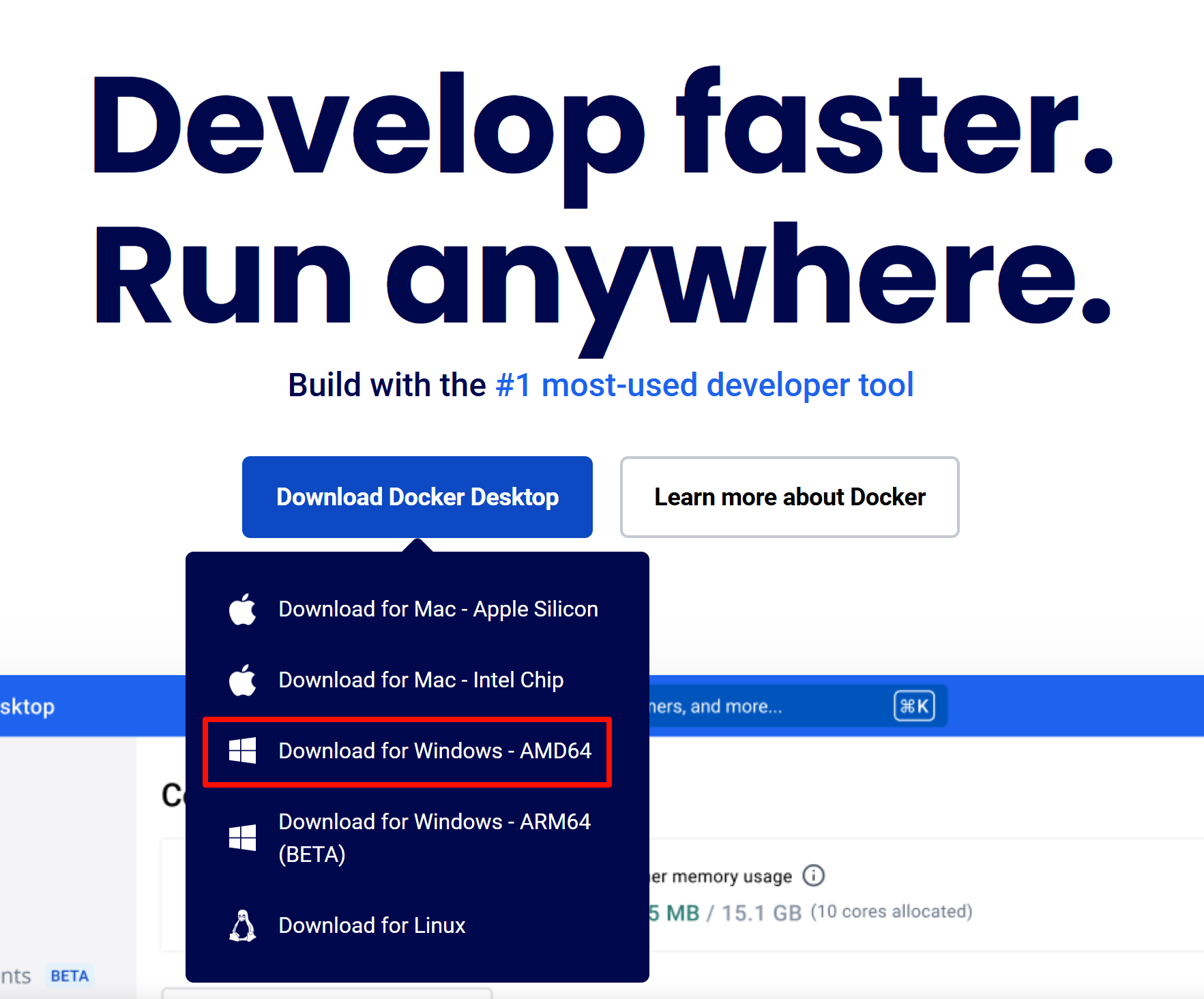 鼠标移动到官网的“Download Docker Desktop”按钮上,再点击“Download for Windows - AMD64”选项下载