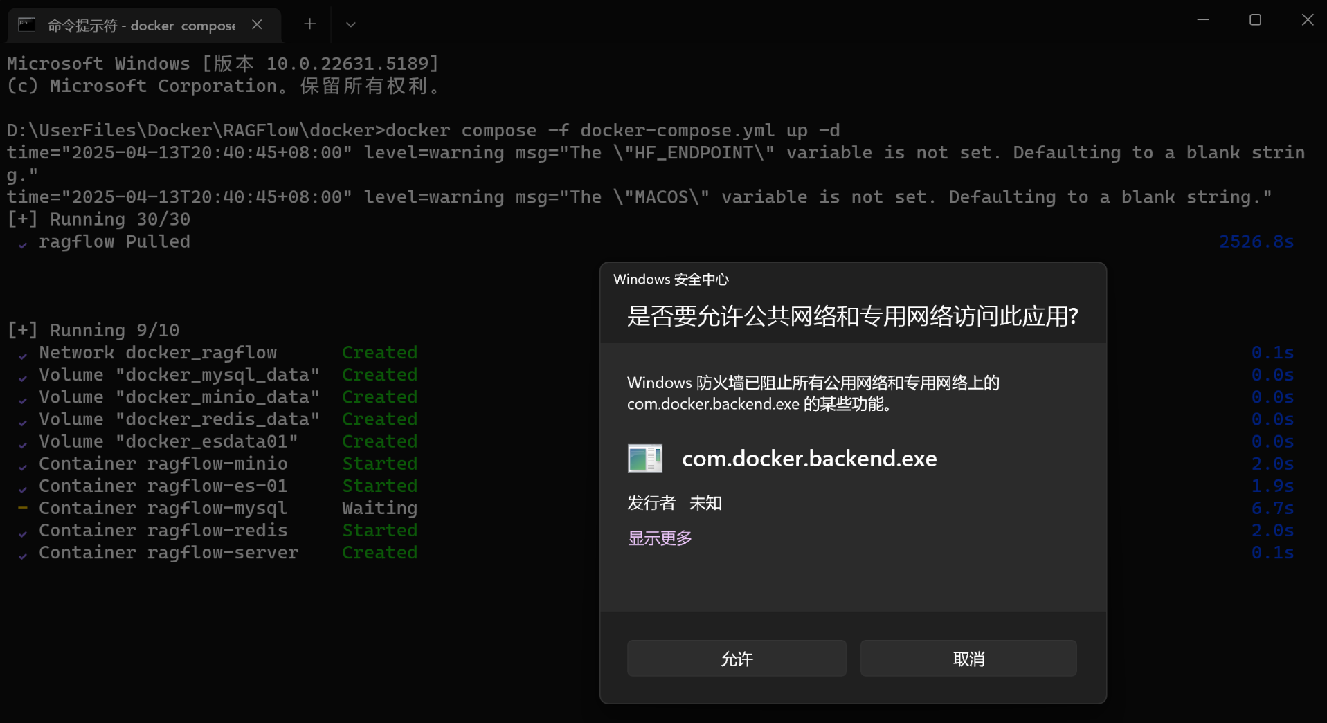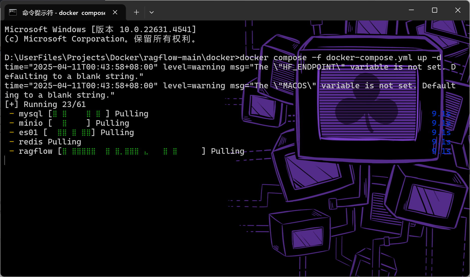 输入命令 docker compose -f docker-compose.yml up -d ,按回车运行,Docker会开始部署RAGFlow