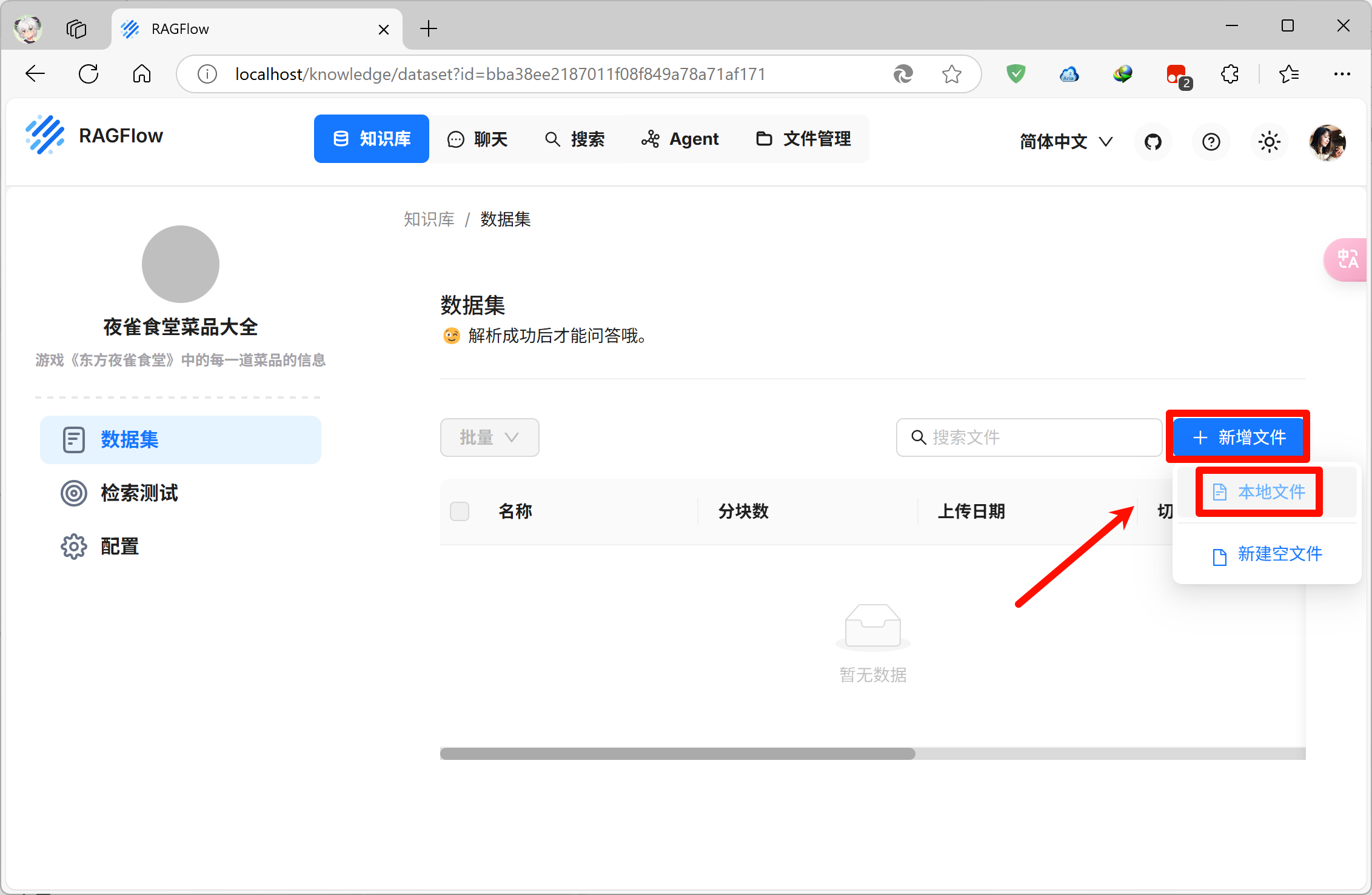 之后会进入知识库的页面,点击右侧的新增文件,再点击本地文件,即可上传需要放进知识库里的文件