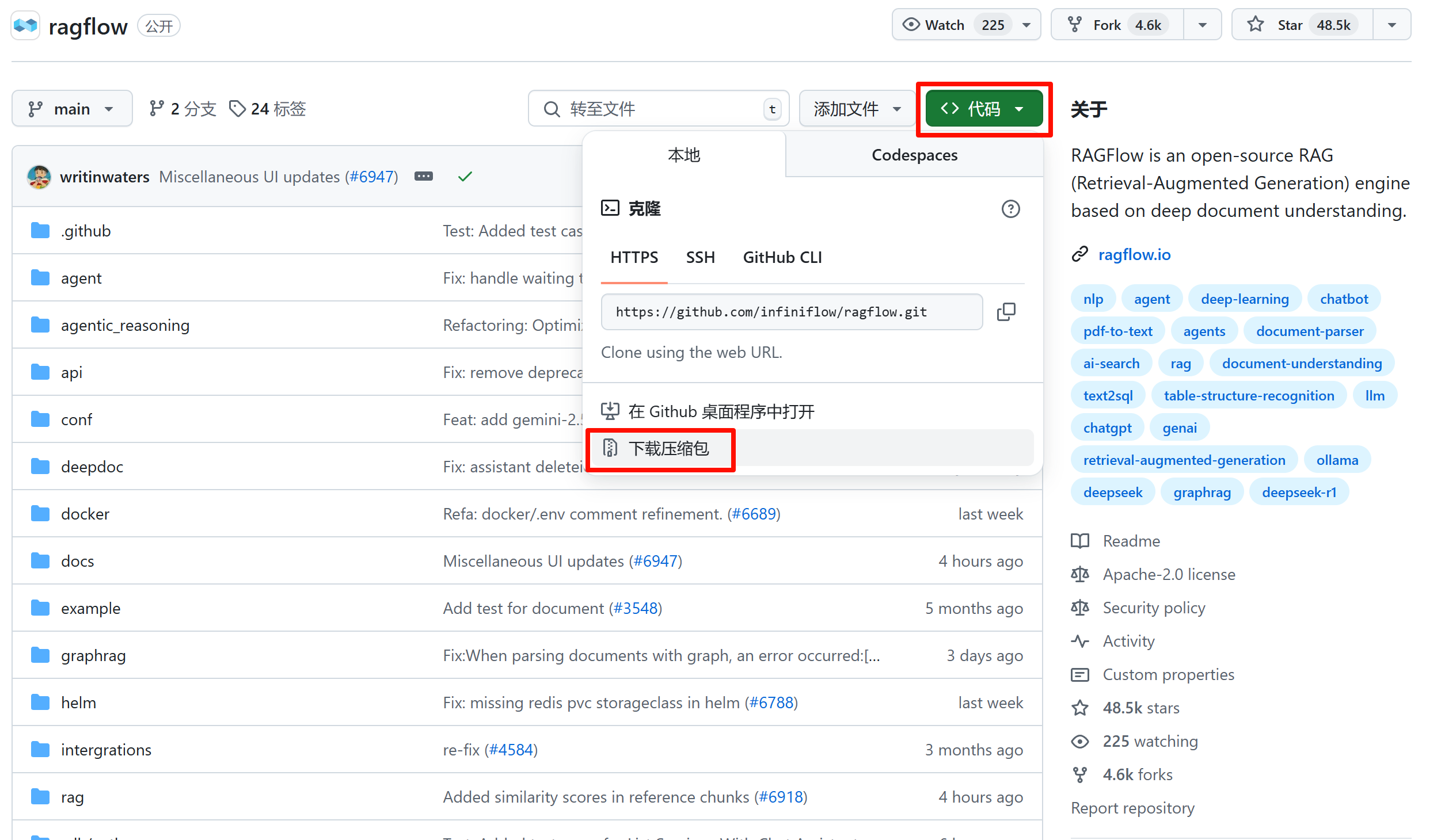 点击右上角的“代码”按钮,再点击“下载压缩包”,下载最新版本的文件