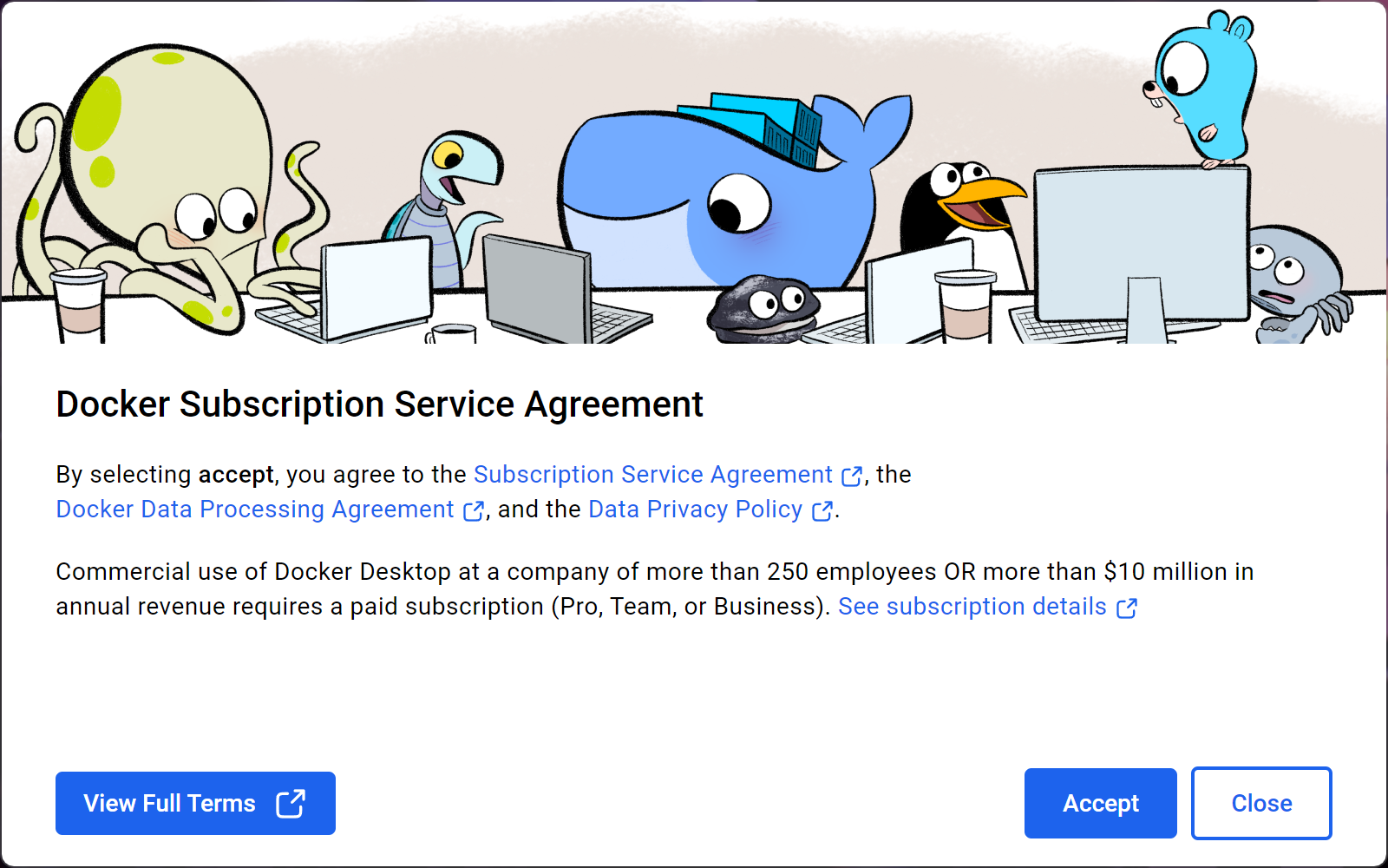 重新进入桌面,Docker会自动运行并弹出一个窗口,要求你同意服务协议,点击Accept即可