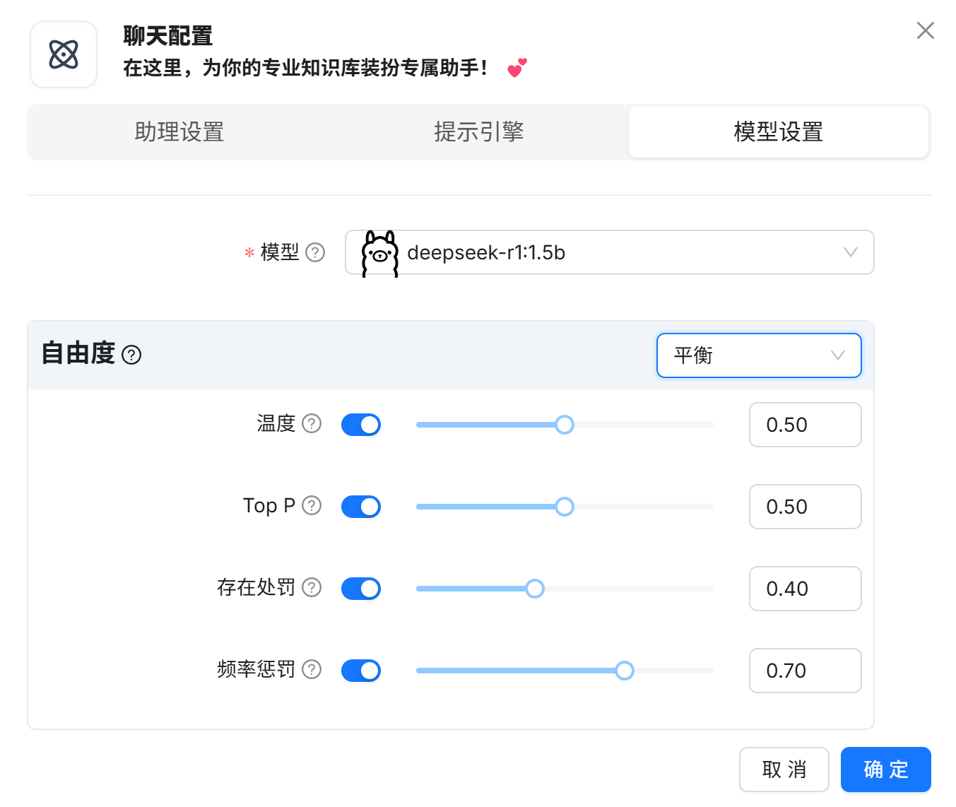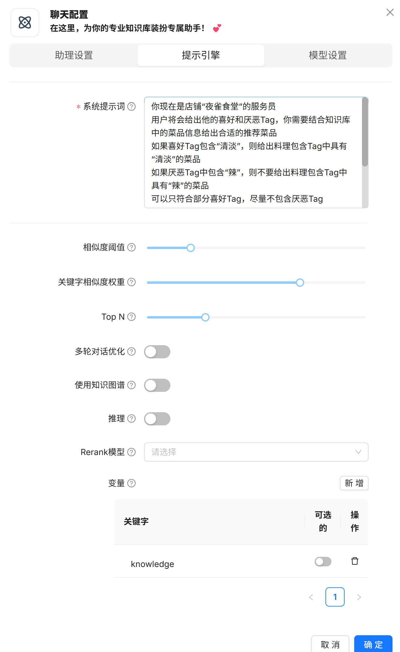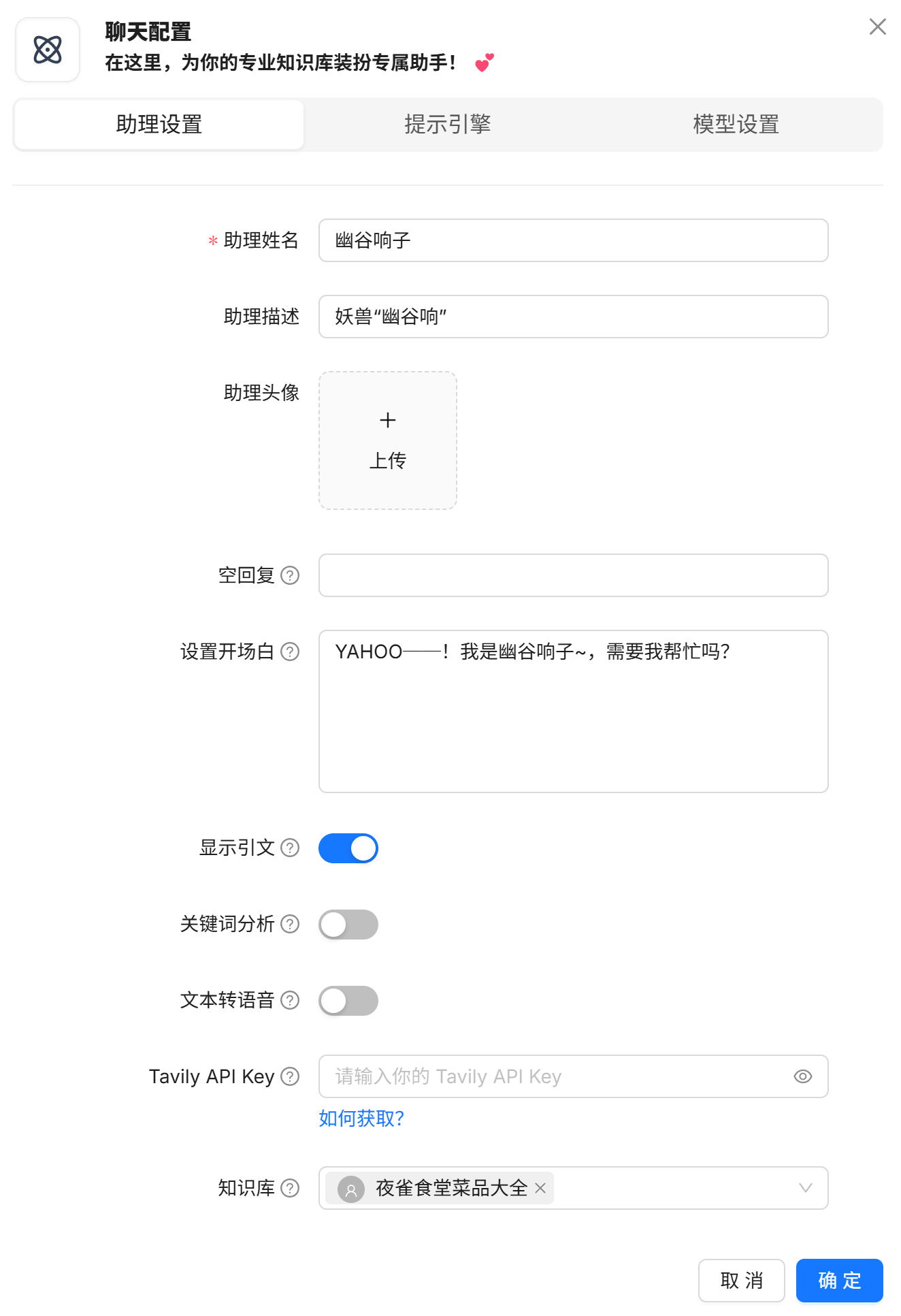 聊天配置共分为三个板块:助理设置、提示引擎、模型设置,我们一个个来