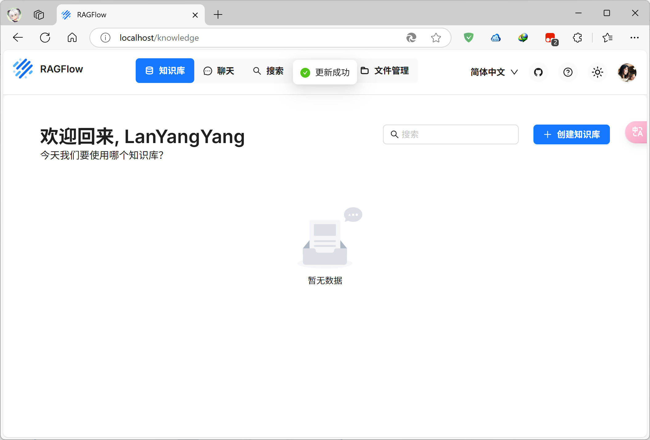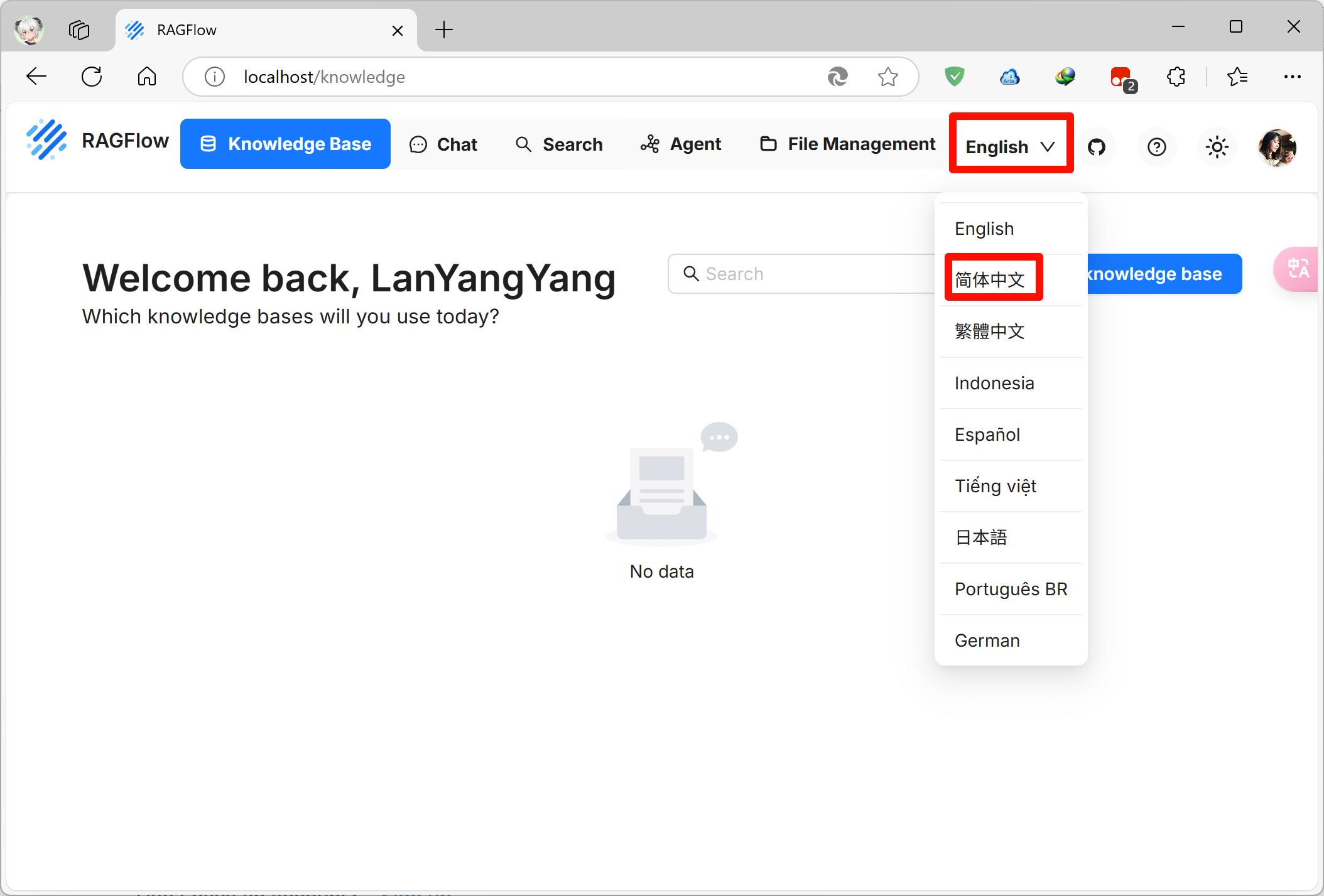 登录成功后在主页右上角有语言选项,选择简体中文后RAGFlow就会使用中文界面