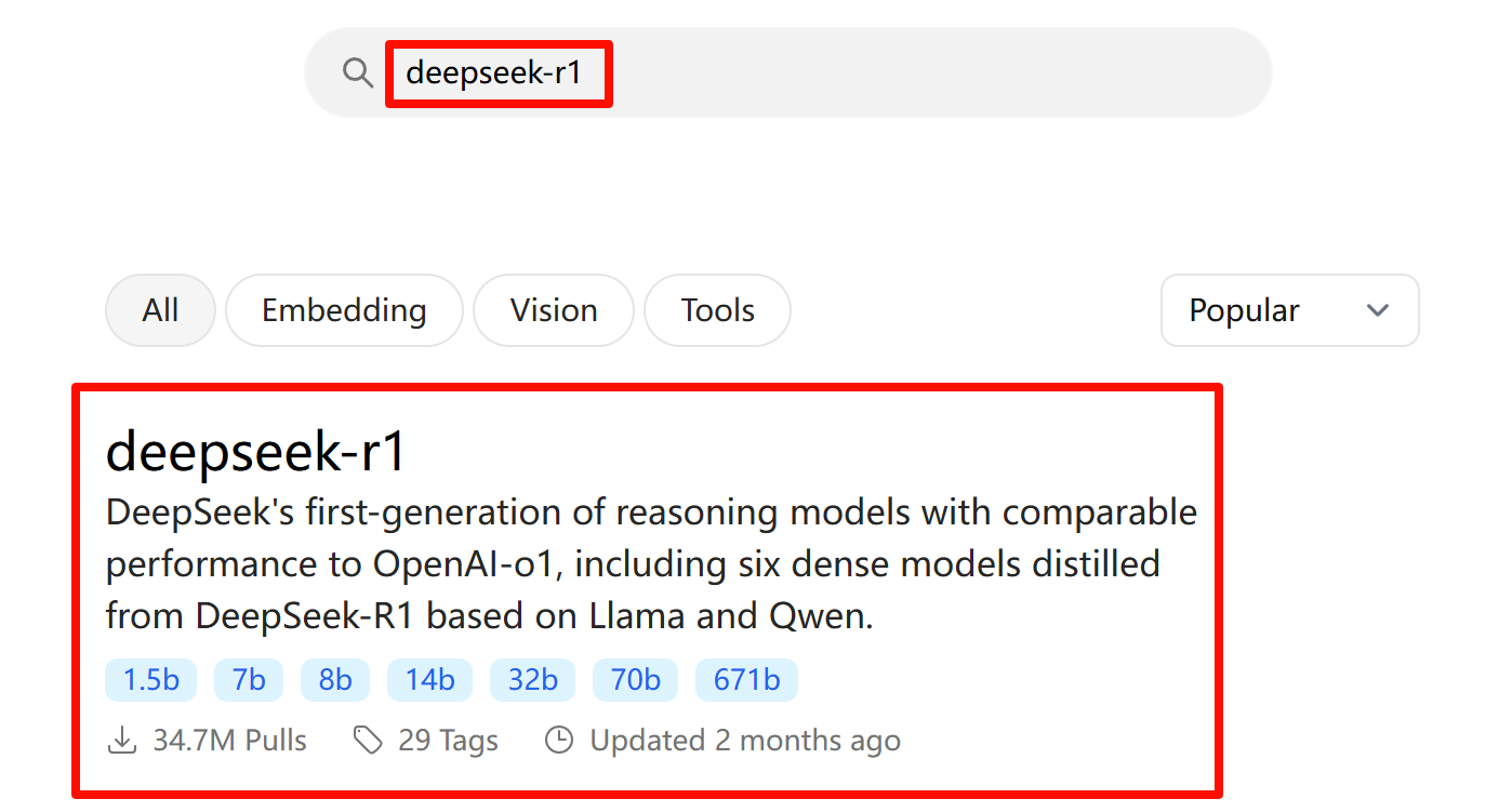 在上方的搜索框输入deepseek-r1,点击第一个结果