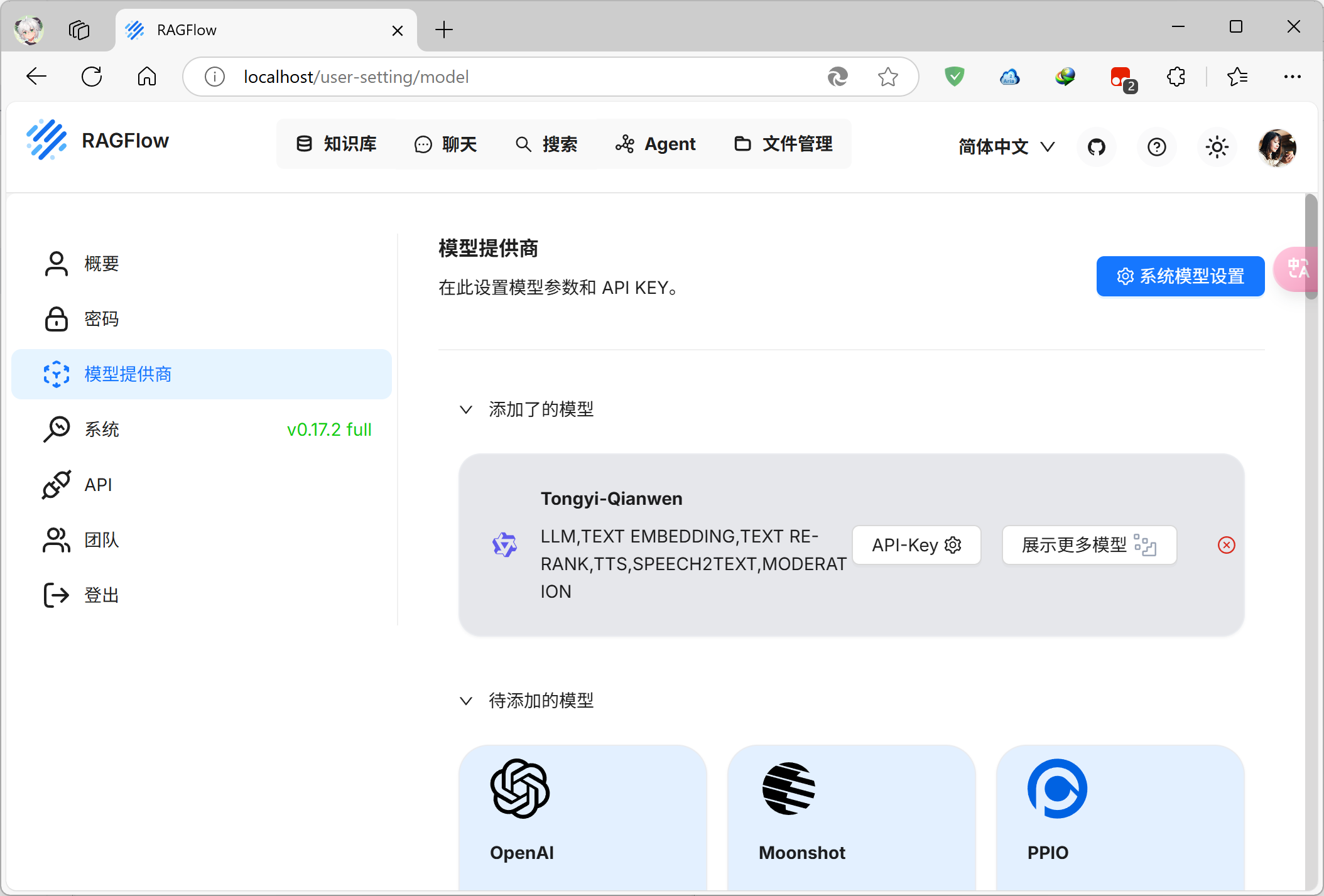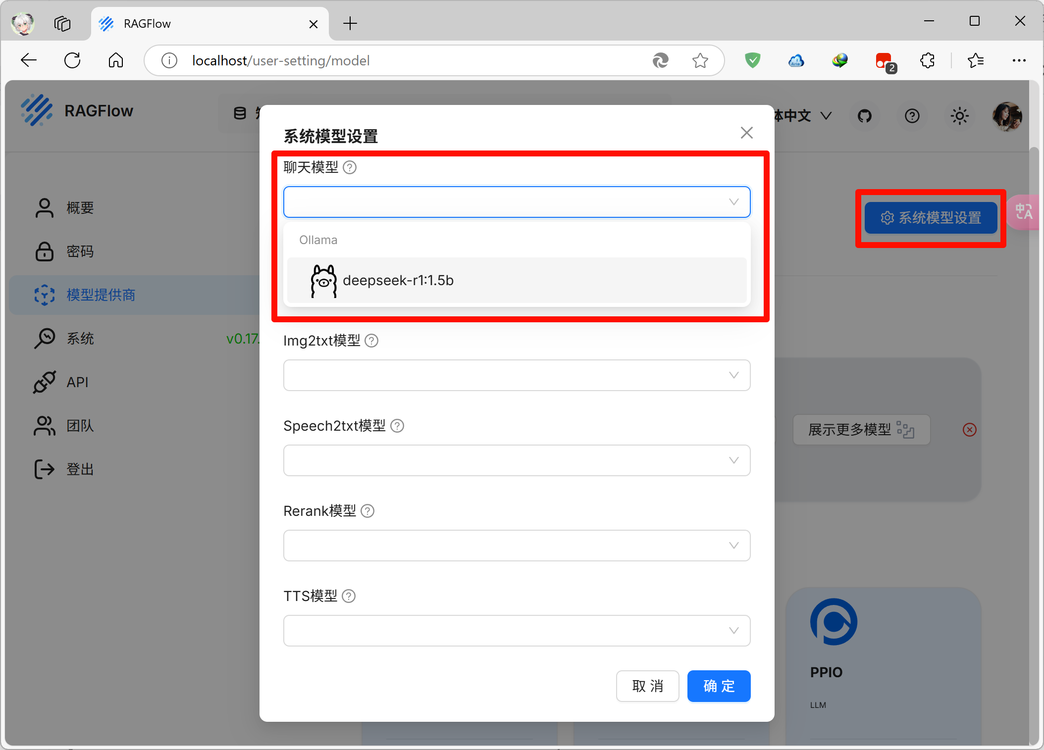 然后点击右上角的系统模型设置,聊天模型中选择刚刚添加的ollama,这样RAGFlow就会在对话时调用ollama了