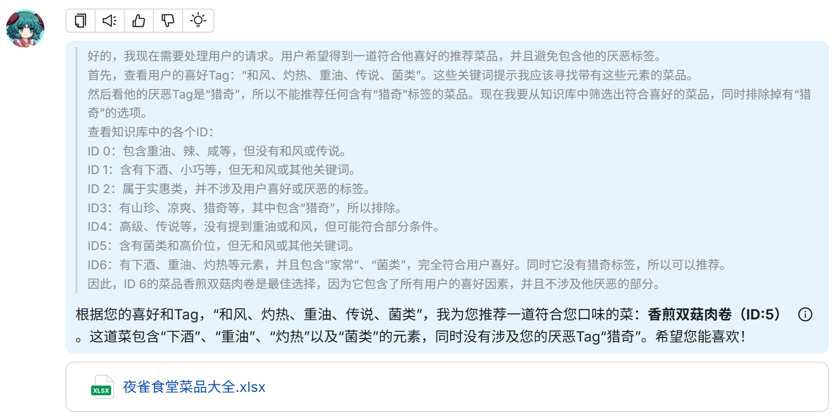 这里找了游戏中另一位的角色信息,让模型给出推荐菜品