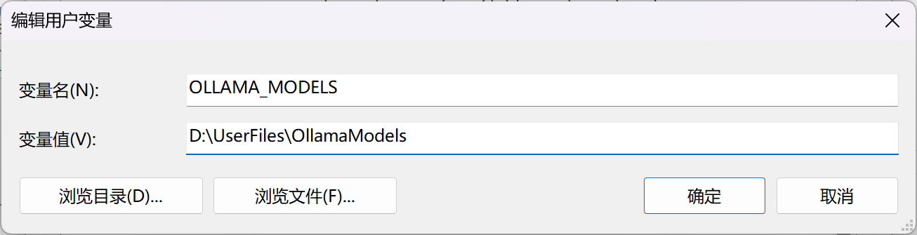 新建Ollama_MODELS变量,值为D:\UserFiles\OllamaModels
