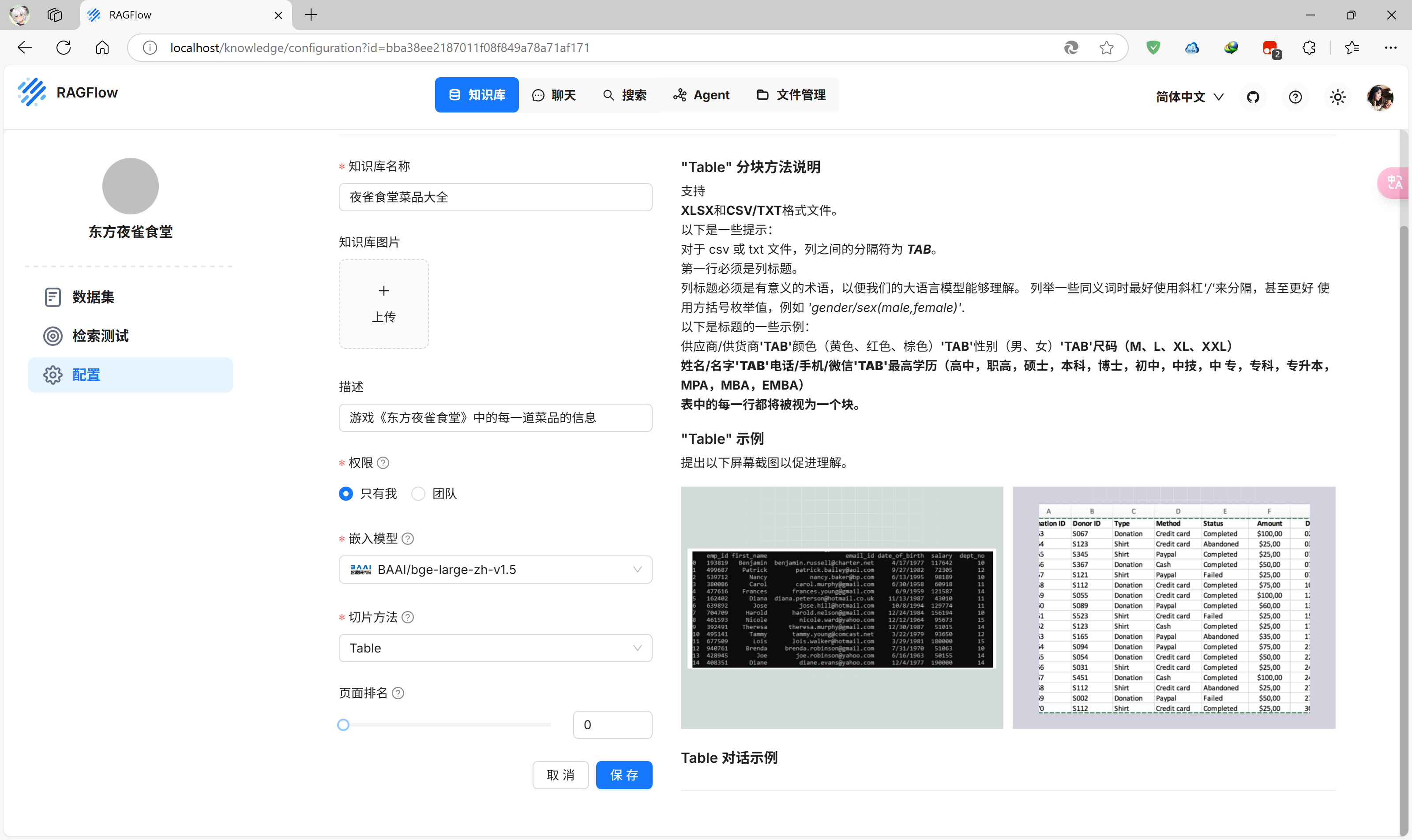输入知识库名字“夜雀食堂菜品大全”,进入更详细的配置页面