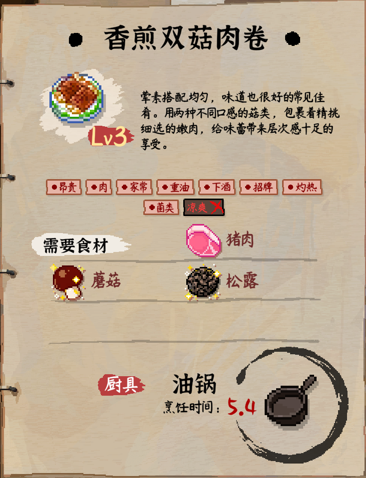 可以看到模型成功给出了推荐菜品"香煎双菇肉卷",这道菜品包含灼热、重油、菌类三个喜好Tag,并且不包含厌恶Tag“猎奇”