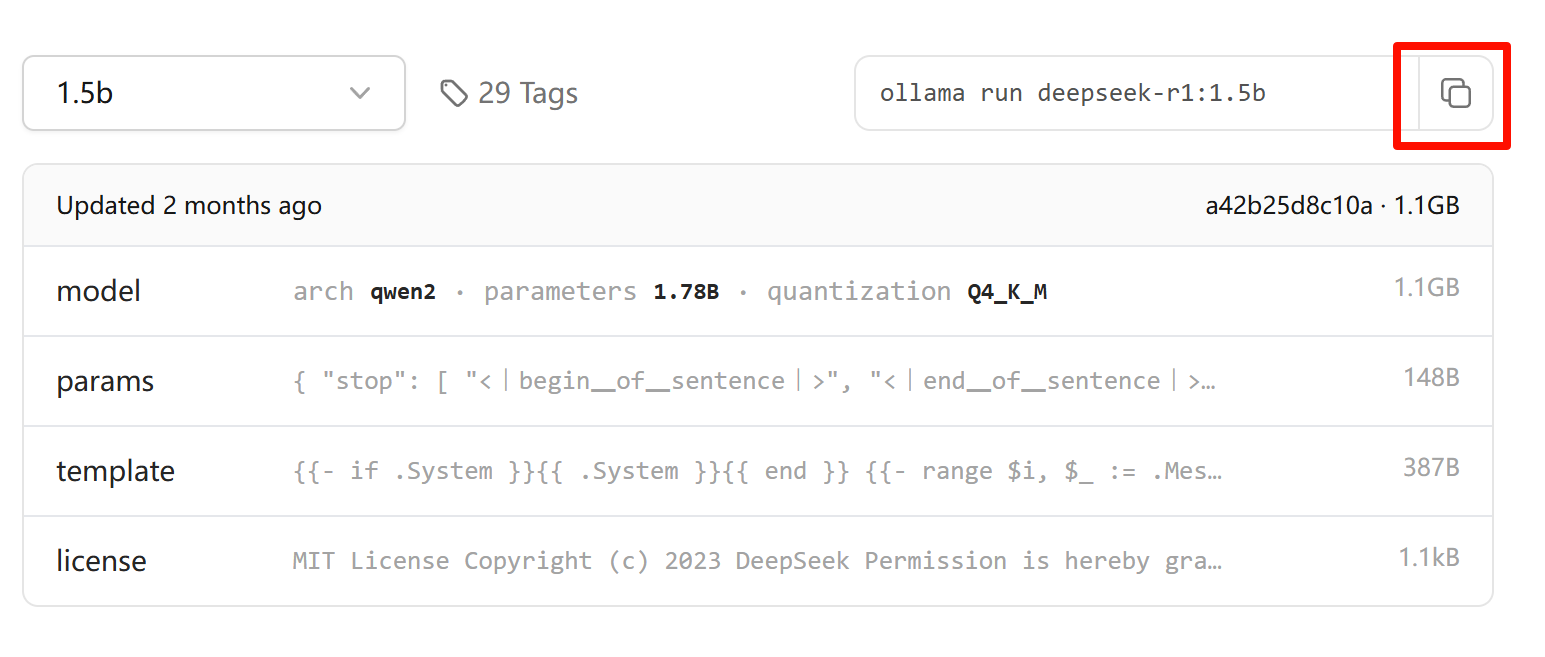 在下拉菜单选择1.5b后,页面右侧会出现命令提示,点击最右边的按钮复制下来
